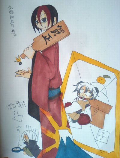 デジカメバージョンの携帯カメラで撮影して乗っける技で。macと仲良くなるには、もう少しかかりそうです。とりあえず、正月三が日から一日遅れましたが、オリキャラ(おなじみ)版年賀絵です。